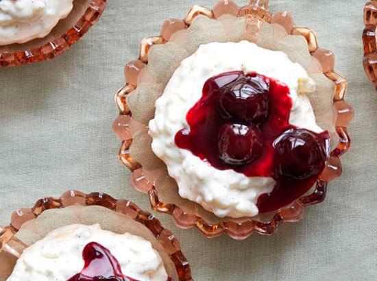 Sild med løg, kapers & karrysalat Æg pyntet med rejer og mayonnaise Røget laks med asparges Kamsteg med rødkål Slagterens sylte med sennep & rødbeder Ris a la mande med kirsebærsauce